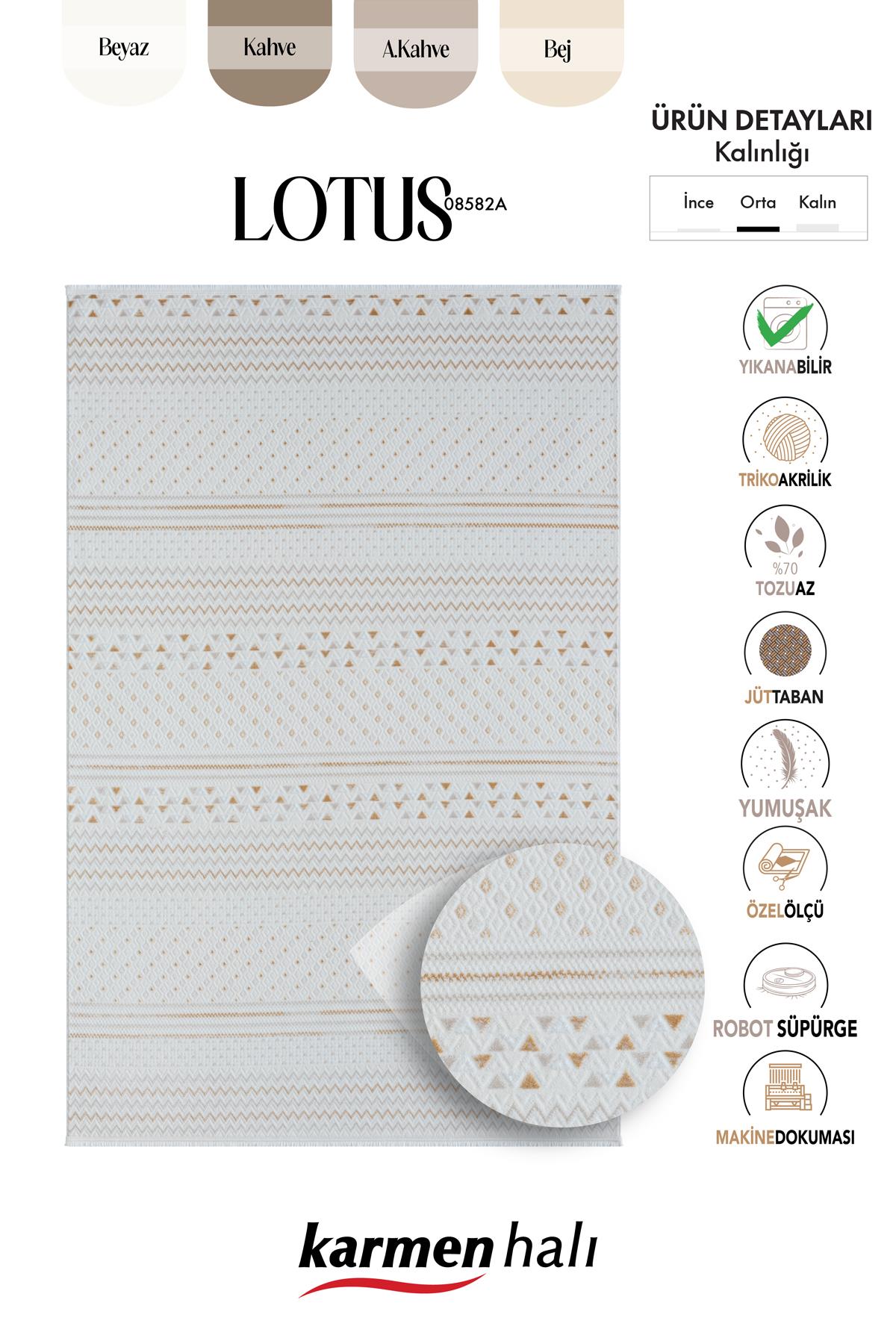 Karmen Halı Lotus Plus 08582a, beyaz zemin üzerindeki bej kilim desenleriyle modern ve klasik tarzı bir araya getiriyor. Triko akrilik ve pamuk malzemelerle üretilen bu halı, salon ve yatak odası gibi yaşam alanlarına şıklık ve konfor katıyor. İnce ve hafif yapısıyla pratik bir kullanım sunan halı, toz tutmayan özelliğiyle hijyenik bir seçenek sunar. 7 mm hav yüksekliği ve 2100 gr/m² ağırlığı ile zarif bir görünüme sahiptir.